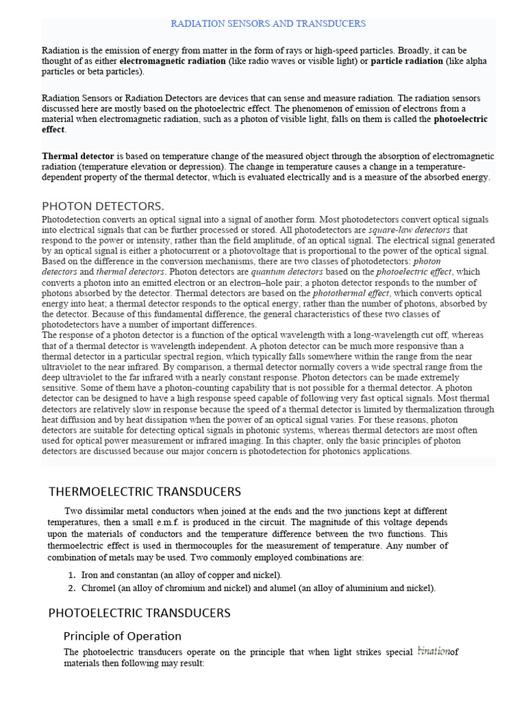Sensors and Transducers PDF Radiation Sensors And Transducers Pdf sensors and transducers. this chapter presents an overview of sensors and their classifications as thermal, magnetic optical, mechanical and chemical. focused research efforts in improving radiation detection capabilities can be separated into developing new sensor. what is remote sensing? Scintillation detectors and storage phosphors. The energy earth receives from the sun is called electromagnetic radiation. In. Radiation Sensors And Transducers Pdf.